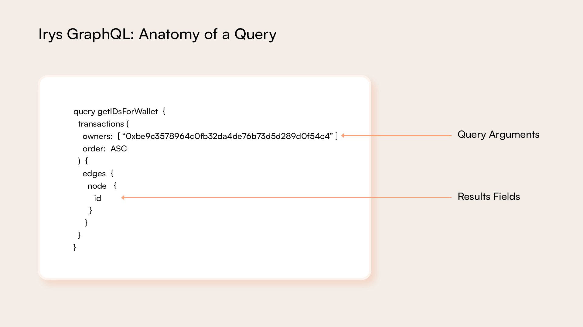 Queries return transaction metadata. To then retrieve data, use the returned transaction ID and download the data from the Irys gateway using a URL formed as follows:
